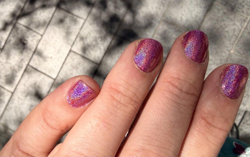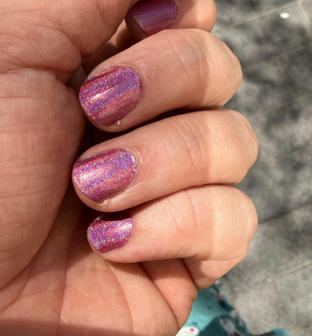A light pink linear holographic nail polish.