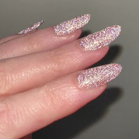 A rose gold nail polish with a soft pink / gold / green shifting large particle shimmer and silver reflective glitters.