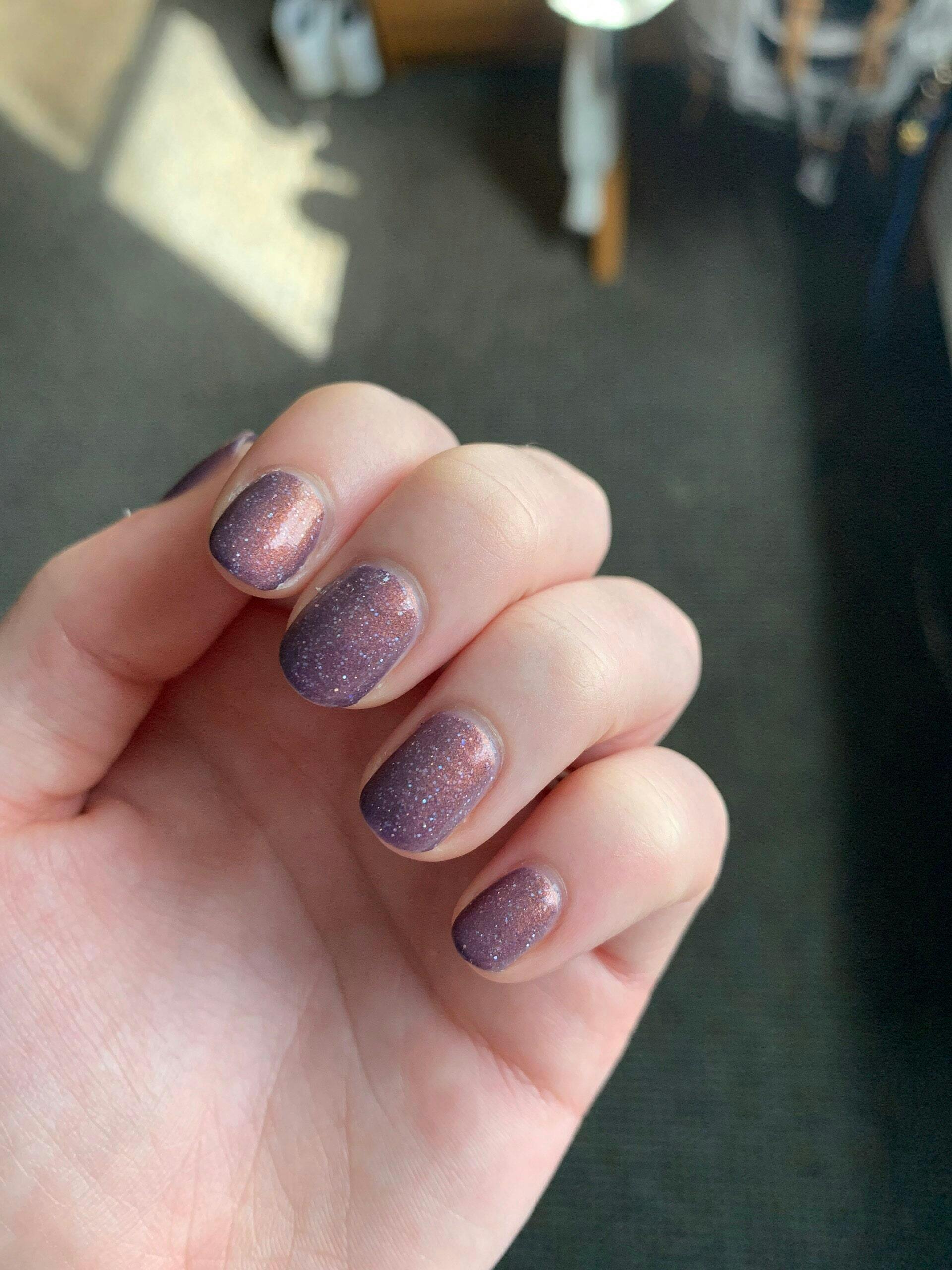 A coppery pink / red ( warm ) to purplish grey ( cold ) thermal nail polish with strong copper shimmer and holographic silver micro glitters.