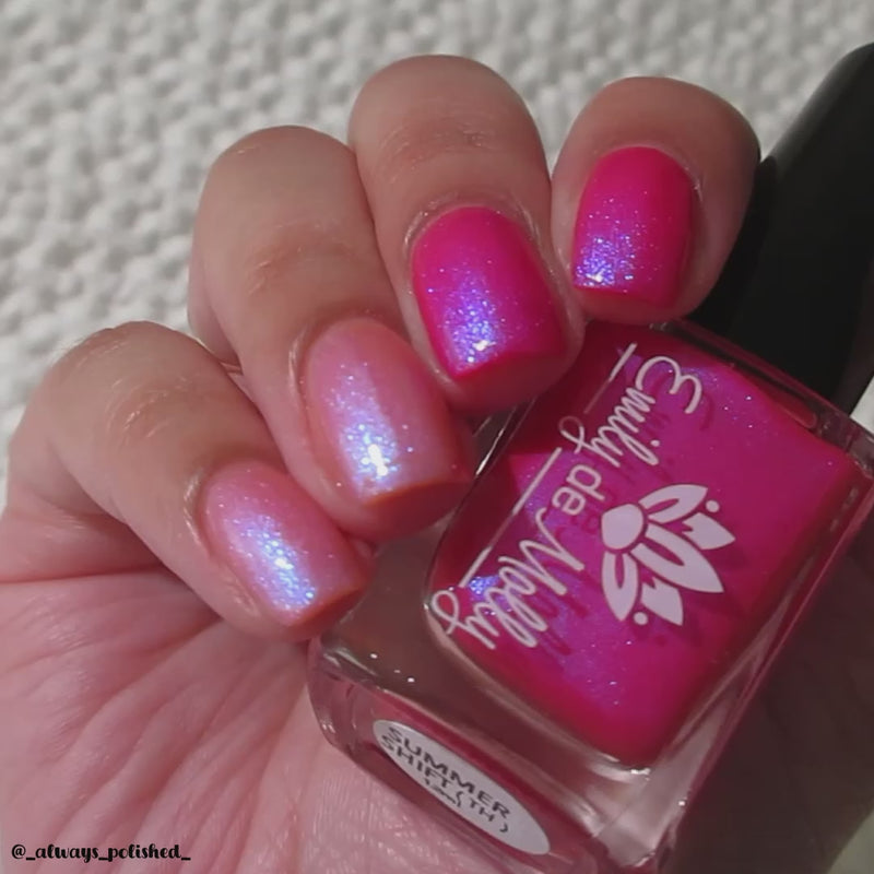 A thermal nail polish that shifts from a pale peachy pink ( warm ) to a bright pink ( cold ) with a blue aurora shimmer.